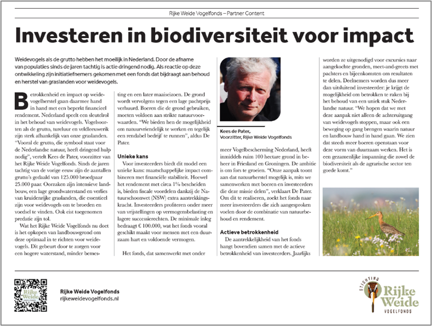 In 2024 is het artikel 'Investeren in biodiversiteit voor impact' verschenen in het Financieel Dagblad.
